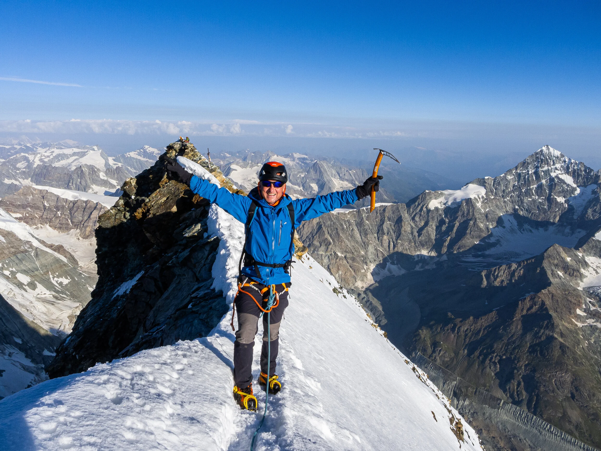 Dickie on the stunning Lenzspitze - Nadelhorn traverse in the Mischabel massif. The bulk of the Dom dominates the background.